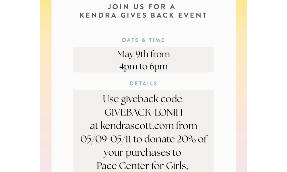 Can’t attend in person? Shop online at kendrascott.com May 9–11 using code GIVEBACK-LONIH to contribute.